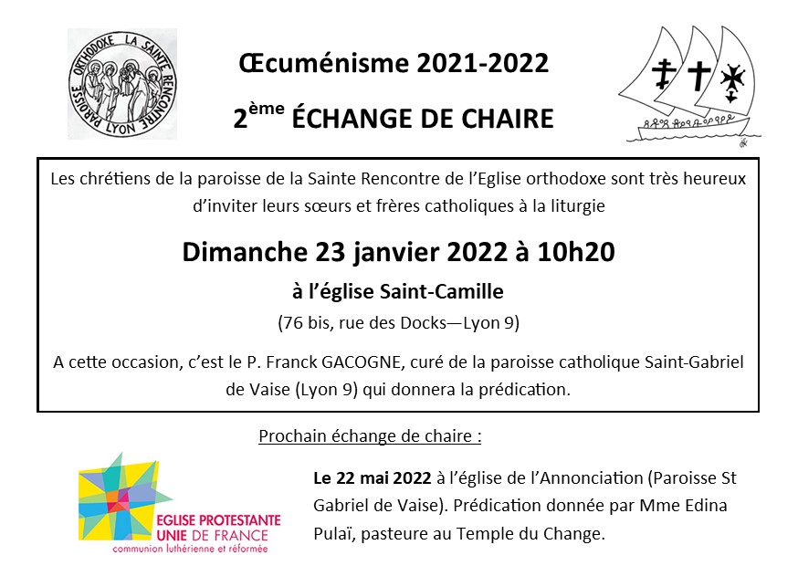 Les orthodoxes de la paroisse de la Sainte Rencontre nous invitent à la liturgie à l’église Saint-Camille (76 bis, rue des Docks – Lyon 9) à 10h20 dimanche 23 janvier. C’est le P. Franck Gacogne qui donnera la prédication.