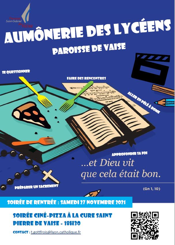 L’aumônerie de la paroisse de Vaise invite les lycéens à un temps de rencontre : Soirée ciné-pizza à la cure de St-Pierre de Vaise à 18h30.
